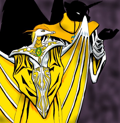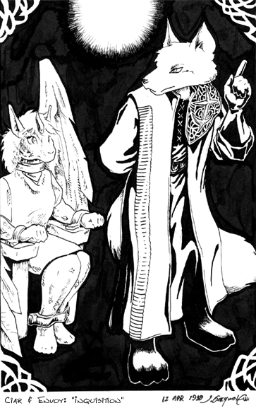 [486 x 500] 82573 bytes, 6/3/2018 Envoy's "Dragon" Aspect faces off with her "Black Father" Aspect in a dream realm dominated by Inala. Brush and ink on paper, colored in Painter Classic. (13 Dec 2000) by Jordan Greywolf - Edit entry | |